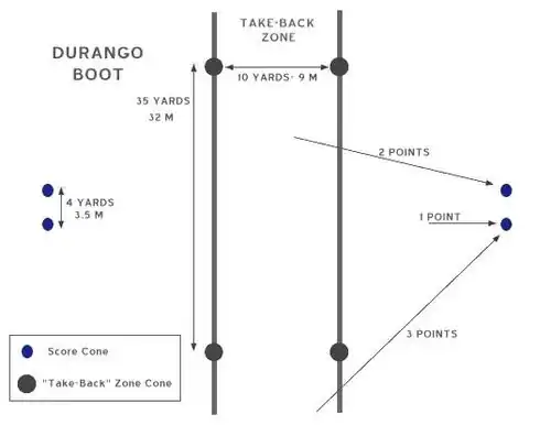 Quatre autres cônes servent de cibles. Ils sont placés deux à deux de chaque côté du take-back, à 20 yards (env. 18 mètres) de ce dernier et chacun à 4 yards (env. 4 mètres) du cône le plus proche.
