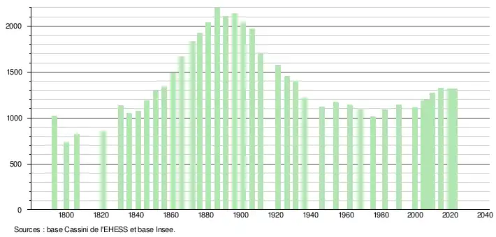 L'évolution du nombre d'habitants est connue à travers les recensements de la population effectués dans la commune depuis 1793. Pour les communes de moins de 10 000 habitants, une enquête de recensement portant sur toute la population est réalisée tous les cinq ans, les populations de référence des années intermédiaires étant quant à elles estimées par interpolation ou extrapolation[17]. Pour la commune, le premier recensement exhaustif entrant dans le cadre du nouveau dispositif a été réalisé en 2004[18].