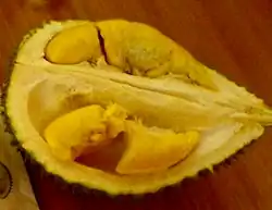 Ce fruit, lui aussi appelé durian, est récolté en Asie du Sud-Est (et au Bangladesh) mais également dans les îles du Pacifique et en Amérique du Sud. On en trouve, par exemple, sur les marchés de Guyane fin mars, début avril. Il se présente comme une grosse baie ovoïde (parfois plus de 40 cm de longueur), pesant jusqu'à 5 kg, avec une carapace de grosses épines et poussant en haut de grands arbres. Il est connu pour son goût particulier et sa forte odeur (à tel point que de nombreux pays d'Asie du Sud-Est l'interdisent dans les lieux publics et dans les transports en commun).