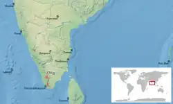 Cette espèce est endémique du Sud des Ghâts occidentaux en Inde[1]. Elle se rencontre au Kerala et au Tamil Nadu entre 1 000 et 1 500 m d'altitude.