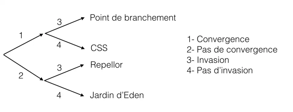 Dans un scénario évolutif de type Jardin d'Eden (Figure 5), on a un point d’équilibre stable mais non convergent. L’équilibre ne peut donc pas être atteint bien qu’il représente un idéal évolutif du point de vue de ce trait et l’évolution ira dans le sens d’un éloignement de cet équilibre. Le fait que l’équilibre pour un trait donné ne peut être atteint peut traduire l’effet de conflits évolutifs entre niveaux de sélection notamment l’impact contraintes évolutives d’autres traits sur le trait étudié.