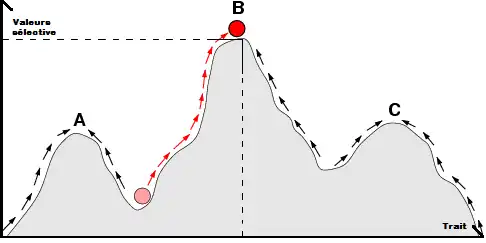 Nous observons sur la Figure 1 un paysage adaptatif avec 3 points d’équilibres (A, B, C). Le point d’équilibre B est le point avec la meilleure valeur sélective pour une variation du trait. L’évolution va tendre à se rapprocher vers ce point d’équilibre B. Ce type de représentation est cependant une représentation fixe de l’évolution alors que l’environnement ne l’est pas. Puis le nouveau mutant modifie à son échelle son environnement. On préfèrera donc une représentation dynamique comme celle de la Figure 2 qui est plus en adéquation avec la réalité.