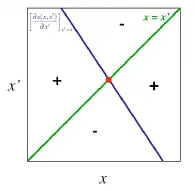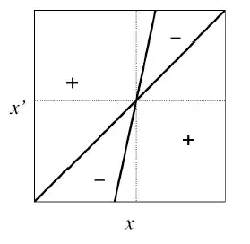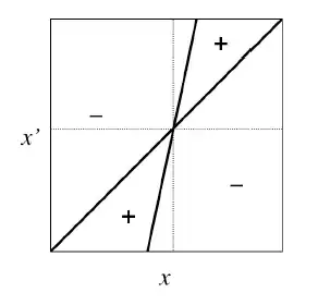 Comme on l’a expliqué, les régions positives représentent la combinaison de trait (x ; x’) pour laquelle le mutant avec le trait x’ peut envahir la population résidente qui possède le trait x ; À l’inverse, les régions négative représente la combinaison de trait pour laquelle un mutant avec le trait x’ ne peut pas envahir le milieu et ainsi disparaît. On peut ainsi déterminer le caractère invasible ou non de la stratégie singulière en regardant dans quelques zones se situent les valeurs de x’. Pour la Figure 4. par exemple à x*, quelles que soient les valeurs de x’ on se trouve dans une région négative, l’équilibre et donc stable et le mutant ne peut pas envahir la population.