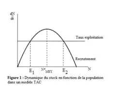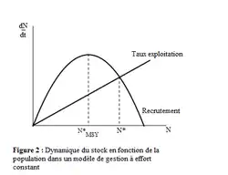 L'équilibre est atteint lorsque le recrutement R, est égal à la mortalité par exploitation F. L’exploitation du stock peut être soumise à différentes gestions permettant de contrôler le taux de mortalité. Un quota de capture peut être fixé, indépendant de la densité de population, mais il est également possible de faire varier le taux de mortalité en fonction des paramètres (biologiques ou économiques) du système.