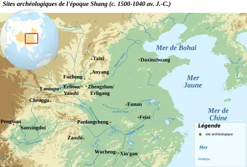 Depuis les années 1930, les trouvailles d'inscriptions oraculaires sur des os et des écailles de tortue à Anyang dans le Henan ont révélé que s'y trouvait alors la dernière capitale des rois Shang, Yinxu, durant la période allant d'environ 1250 à 1050 av. J.-C. Il est possible que les rois ayant régné à partir d'autres sites durant la période précédente, la période d'Erligang (c. 1600-1300 av. J.-C.), aient également été des membres de la dynastie Shang, mais l'absence d'écriture pour cette époque ne permet pas de le confirmer.
