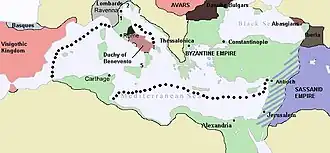 Constant en profite pour se tourner vers les territoires européens de l’Empire et entreprend en 658 une campagne dans les Balkans occupés par les Slaves, la première dans la région depuis l’empereur Maurice[57]. Puis il tourne son attention vers les régions occidentales les plus éloignées de l’Empire : l’Afrique et l’Italie où les disputes religieuses se transforment en rébellions politiques tel que mentionné plus haut.