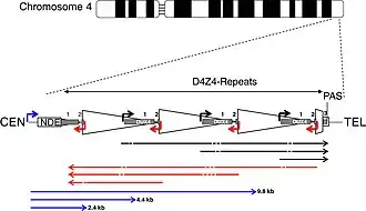 • FSHD1 : pour 95 % des patients, la maladie est due à une réduction (délétion) de la zone D4Z4 au bout du chromosome 4 sur le bras long en 4q35. Chez les personnes non atteintes, il y a plus de 11 répétitions D4Z4 dans cette zone. Chez les patients FSH, il y a moins de 10 répétitions ; et plus le nombre de répétitions est faible, plus les symptômes sont sévères[6]. La technique de peignage moléculaire permet de faire le diagnostic de cette anomalie de façon fiable[25] ;