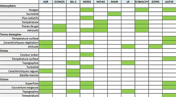 Le satellite d'observation de la Terre ENVISAT mesure de manière continue à différentes échelles les principaux paramètres environnementaux de la Terre relatifs à l'atmosphère, l'océan, les terres émergées et les glaces. Les différents capteurs des instruments embarqués doivent :