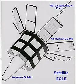 Le satellite EOLE d'une masse de 83 kg circule sur une orbite basse de 903 x 878 km avec une inclinaison de 50°. Son antenne est orientée vers la Terre par une stabilisation par gradient de gravité. L'équipement original est le dispositif de localisation des balises. Il est basé sur la variation de fréquence Doppler d'un signal d'oscillateur ultra-stable qui est émis par le satellite et renvoyé par la balise en cohérence de phase. Cette méthode Interrogation-Réponse permet d'envoyer des ordres à la balise. Avec six ou sept points de mesures successifs, quand le satellite passe en visibilité de la balise, la localisation est obtenue à quelques centaines de mètres près.