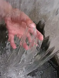 Majoritairement observable sur Terre à l'état liquide, l'eau est en effet un puissant solvant d'autant qu'elle est plus pure : elle dissout facilement ou solubilise rapidement de nombreux corps ioniques, comme les matières salines, à l'image du sel et du gypse qu'elle peut transporter, ainsi que de nombreux autres gaz[d], par exemple les composants de l'air, en particulier l'oxygène ou le dioxyde de carbone. L'expression « solvant universel »[14] est toutefois sujette à maintes précautions, beaucoup de matériaux naturels (roches, métaux, etc.) étant insolubles dans l'eau (dans la plupart des cas ou de manière infime). Du fait de sa masse volumique, l'eau qui se meut par gravité peut arracher et mettre en suspension un grand nombre de corps, petit et gros, ce qui accroît d'autant la densité apparente de la phase liquide en mouvement, et explique la force d'arrachement et de ravinement des flux d'eaux boueuses ou composites de roches et végétaux, ces derniers nommées "laves" dans diverses traditions montagnardes, causant un recouvrement final en bout de pente ou lors du retrait.