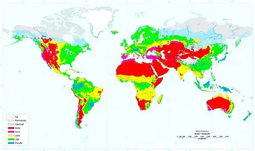 Les déserts et terres arbustives xériques (écorégion terrestre du WWF), correspondant aux climats désertiques (BWh et BWk), voire semi-arides (BSh et BSk) sont des écorégions dans lesquelles, l'évaporation dépassant les précipitations, il est difficile voire impossible de maintenir des cultures. De nombreux déserts, comme le Sahara, sont chauds toute l'année, mais d'autres, comme le désert de Gobi en Asie, sont devenus tout à fait froids en hiver. La végétation y est rare, basse et atrophiée. Elle a évolué pour minimiser la perte d'eau (xérophyte). La biodiversité animale y est tout aussi bien adaptée et diversifiée. Ces régions autorisent un pastoralisme nomade[28]. Ce sont des écorégions très sensibles au pâturage ou au surpâturage, à la perturbation du sol, à la combustion, au labour, et autres modifications de la couverture. Certaines tentatives de conversion des terres à l'agriculture pluviale ou non y ont été catastrophiques.