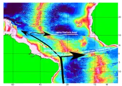 Dans le bassin des Guyanes, à l'ouest de 40° W, la topographie en pente et le fort courant profond des bordures ouest qui coule vers l'est gênerait l'écoulement vers l'ouest des eaux profonde antarctique : elles tournent donc vers le nord sur le versant est du massif sous-marin du Ceará. À 44° W, au nord de ce massif, les eaux de fond de l'Antarctique s'écoulent vers l'ouest à l'intérieur du bassin. Une grande partie de l'eau de fond de l'Antarctique pénètre dans l'Atlantique Est par la zone de fracture de Vema[12].