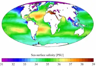La salinité est un des paramètres les plus importants de l'eau de mer, et désigne la teneur en sels dissous. La salinité moyenne des océans est de 35 g/l, et reste généralement comprise entre 30 g/l (Atlantique Nord) et 40 g/l (mer Rouge)[7]. La mer Baltique, semi fermée et recevant de nombreuses fleuves, fait exception avec une salinité compris entre 3 et 8 g/l[8]. Les mers intérieures ou assimilées ont une salinité supérieure, parce que l'évaporation y concentre le sel. Les exceptions concernent donc des mers fermées ou semi-fermées, comme pour les valeurs extrêmes de 6 g/l dans les eaux de surface de la mer Baltique et 275 g/l dans la mer Morte. La mer ouverte la plus salée est la mer Rouge.