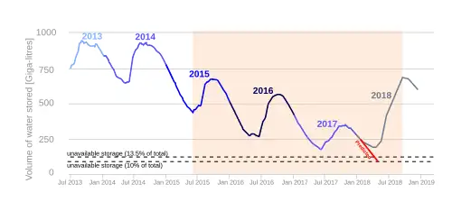 Avec le réchauffement climatique, la saison sèche devient plus longue et plus sèche, conduisant à une augmentation des pénuries. L'année 2019 voit ainsi des niveaux d'eau 10 % à 60 % inférieurs à ceux de 2018[2]. Cette année-là, le président Cyril Ramaphosa reconnaît que « la situation est terrible » dans cinq des neuf provinces sud-africaines[3].