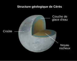 La présence de vapeur d'eau a été détectée dans l'atmosphère de Cérès. La présence de geysers expulsant de la vapeur d'eau sur Cérès peut être liée à l'existence d'un océan d'eau liquide sous sa surface[39],[40],[41]. Les taches claires de Cérès pourraient également avoir une origine hydrothermale et être issues d'eau liquide souterraine. L'existence dans le passé d'eau liquide qui s'est depuis solidifiée est également envisagée, suggérée par une présence importante de glace et sa séparation des couches de roches[42].