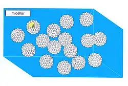 En chimie colloïdale, une eau micellaire consiste en un solvant, de l'eau dans ce cas-ci, dans lequel des micelles (de petites particules) sont en suspension. Les micelles sont formés d'éléments chimiques qui ont la particularité d'être attirés à la fois par l'eau et les substances grasses. Les éléments qui ont cette particularité sont appelés amphiphiles. Dans une eau micellaire, certains amphiphiles sont groupés et d’autres sont isolés. On parle d'eau micellaire lorsque la concentration d'amphiphile dépasse la concentration micellaire critique (CMC) ou la concentration critique d'agrégation (CAC), autrement dit lorsqu'il y a suffisamment d'amphiphiles dans la solution pour s'agglutiner et former des micelles. Lorsque le concentration en amphiphiles augmente, des cristaux liquides lyotropes se forment[1],[2],[3],[4].