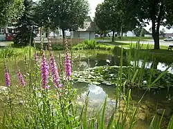 L'étang du village de Heinstetten en Allemagne, un exemple d'eau stagnante équilibré, favorable à la biodiversité et dont la végétation joue son rôle en matière de phytoépuration. Ce type d'eau stagnante saine, rafraîchissante l'été et possédant un aspect ornemental est perçu positivement par les riverains.