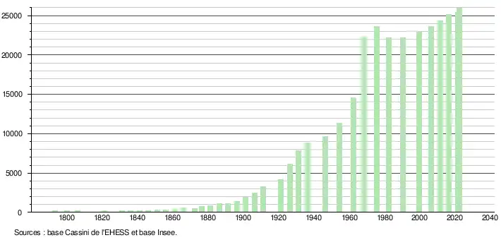 - ↑ Par convention dans Wikipédia, le principe a été retenu de n’afficher dans le tableau des recensements et le graphique, pour les populations de référence postérieures à 1999, que les populations correspondant à une enquête exhaustive de recensement pour les communes de moins de 10 000 habitants, et que les populations des années 2006, 2011, 2016, etc. pour les communes de plus de 10 000 habitants, ainsi que la dernière population de référence publiée par l’Insee pour l'ensemble des communes.