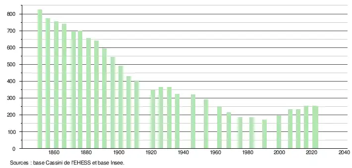 L'évolution du nombre d'habitants est connue à travers les recensements de la population effectués dans la commune depuis 1851. Pour les communes de moins de 10 000 habitants, une enquête de recensement portant sur toute la population est réalisée tous les cinq ans, les populations de référence des années intermédiaires étant quant à elles estimées par interpolation ou extrapolation[18]. Pour la commune, le premier recensement exhaustif entrant dans le cadre du nouveau dispositif a été réalisé en 2006[19].