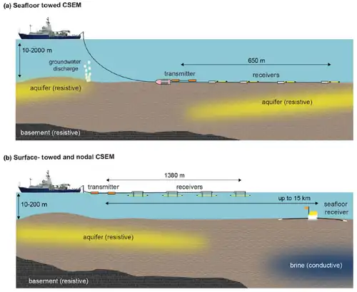 - Les méthodes de sismique réflexion fournissent des contraintes indirectes sur les hétérogénéités contrôlant la distribution des OFG[19]. Les levés électromagnétiques (EM), généralement collectés à l'aide de systèmes électromagnétiques à source contrôlée (CSEM), sont utilisés pour distinguer les régions saturées d'eau salée (moins résistive) de celles contenant de l'eau souterraine douce (plus résistive) (voir infra)[20].