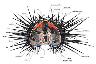 Le système digestif des oursins est relativement simple, et se compose principalement d'un long conduit composé d'un œsophage (situé dans la lanterne d'Aristote), suivi d'un estomac formant une boucle, puis d'un intestin plus ou moins complexe[35] ; un rectum précède l'anus, et chez la famille des Diadematidae ce dernier est surmonté d'une papille anale, au rôle encore peu clair[36].