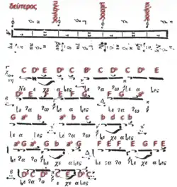 Les premiers traités de musique byzantine ne spécifiaient que le degré de base, c'est-à-dire la note à partir de laquelle se chantait l'échelle de l'echos, ainsi que sa position dans l'échelle d'ensemble des echos. La structure détaillé des echos n'était précisée que de façon très rudimentaire par des diagrammes dans la notation musicale byzantine, comportant des neumes. Il est pratiquement impossible de reconstituer les détails des intervalles musicaux et des structures mélodiques des echos à partir des traités antérieurs au XVIIIe siècle. En fait, seules des comparaisons systématiques assez récentes des echos avec les makamlar de la musique de cour ottomane, telles que celles de Kyrillos Marmarinos, archevêque de Tinos dans son manuscrit de 1747 et les réformes occidentalisantes de la notation byzantine de Chrysanthos de Madytos (en) à la fin du XIXe siècle permettent de comprendre la structure des echos et de tenter la reconstitution des mélodies anciennes.