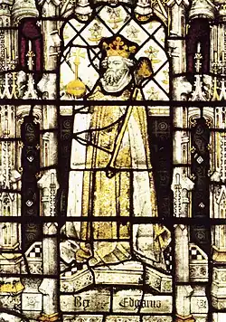 La première conjointe d'Edgar, qui est la mère de son fils aîné Édouard le Martyr, n'est nommée que dans des sources postérieures à la conquête normande. Osbern de Cantorbéry, qui écrit à la fin du XIe siècle, affirme qu'Édouard est le fils d'une religieuse séduite par Edgar, mais les chroniqueurs ultérieurs rejettent son récit[159] et les historiens modernes accordent davantage crédit à Jean de Worcester[160] et Guillaume de Malmesbury[161], qui la nomment Æthelflæd Eneda[5],[158]. D'après eux, elle est la fille de l'ealdorman Ordmær, mais aucun ealdorman ni thegn ne porte ce nom sur les chartes connues du Xe siècle. Cependant, le Liber Eliensis mentionne un échange de terres entre Æthelstan Demi-Roi et un « homme puissant » (vir potens) nommé Ordmær. S'il s'agit du père d'Æthelflæd, Edgar aurait pu la rencontrer pendant son enfance dans la maisonnée du Demi-Roi[162],[160]. Ann Williams la décrit comme sa femme, mais Cyril Hart juge douteuse la légitimité d'Édouard le Martyr[5],[157]. Nicholas Brooks considère que Dunstan n'aurait pas apporté son soutien à Édouard s'il n'avait pas été légitime, et donc qu'Edgar et Æthelflæd devaient être mariés[163]. Quoi qu'il en soit, elle meurt vraisemblablement vers 960[158].