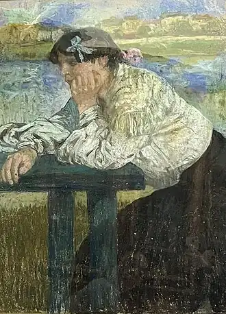 Son inspiration s'attarde sur des figures de femmes rêveuses, aux attitudes délicates. En 1896, Gustave Geffroy évoquait ses figures languissamment peintes dans des colorations effacées, ravivées par un détail, une fleur au corsage ou à la chevelure, des yeux trop translucides, enchâssés comme des pierres précieuses[17].