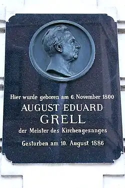 Non loin de Saint-Nicolas dans le centre de Berlin, au numéro 12 de la Poststraße, est né August Eduard Grell, fils du secrétaire secret royal auprès du département des forêts August Wilhelm Grell (1769-1839), qui est un habile joueur d'orgue (actif comme organiste à l'église paroissiale de 1808 à 1839) et son premier professeur de musique. Une plaque commémorative avec un portrait en relief de Fritz Schaper commémore la maison natale de Grell, qui est installée à l'occasion de son 100e anniversaire en novembre 1900 et dont le magistrat berlinois a fait don. L'organiste Karl Kaufmann et Karl Nikolaus Türrschmiedt lui succédent comme professeurs de musique. Son oncle Otto Grell, membre de l'Académie de chant de Berlin, l'influence fortement sur le plan musical en tant que soliste ténor[1].