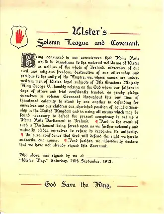 Opposé à toute application d'un Home Rule en Irlande, il milite au sein du Parti unioniste irlandais. Devant l'avancée du projet, il lance une pétition en 1912, l'Ulster Covenant. En 1913, prévoyant de résister par la force à la mise en place du Home Rule, il crée un groupe paramilitaire, les Ulster Volunteers, fort de 100 000 hommes[3].