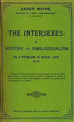 - Xavier Mayne, The Intersexes: a History of Similisexualism as a Problem in Social Life, Privatly Printed, [Naples, 1909-1910 ?] - réédité en 1975 par Arno Press (ISBN 978-0-405073649).
