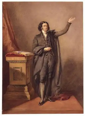 Ce bond soudain de popularité semble avoir été occasionné par une allusion voilée à l'éloquence saisissante d'Irving faite à la Chambre des Communes par Calming, qui avait été amené à assister à ses cultes par admiration pour le texte d'une de ses prières, qui lui avait été citée par James Mackintosh. Sa stature imposante et équilibrée, la beauté sombre et mélancolique de son visage, soulignée plutôt qu'altérée par un léger strabisme, produisaient une forte impression avant même que sa voix profonde et puissante eût fait entendre ses accents dramatique ou mélodieux. Des demi-vérités dures ou superficielles énoncées avec une telle aisance et une telle grâce, non seulement avec un air de conviction absolue, acquéraient une vraisemblance et une importance qui, tout au moins pendant que l'orateur parlait, rendaient ses auditeurs complètement oublieux de leurs objections préconçues. L'objet de ses discours, et son traitement particulier des sujets, du moins au début, également constitué une partie considérable de son attrait.