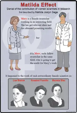 Dans le domaine scientifique, la minimisation ou la dissimulation des recherches et des découvertes menées par des chercheuses[97], connue sous le nom d'« effet Matilda », est un cas de cryptogynie. Il désigne le déni, la spoliation ou la minimisation récurrente et systémique de la contribution des femmes à la recherche scientifique, dont le travail est souvent attribué à leurs collègues masculins.