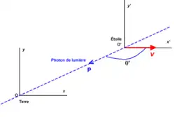 où est l’angle que fait le photon avec l’axe Ox dans le repère de l’étoile. Si la quantité correspond à la composante radiale de la vitesse relative entre émetteur et récepteur dans le repère de l’étoile, c’est-à-dire