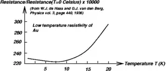 La dépendance de la résistivité à la température , comprenant l'effet Kondo, s'écrit :