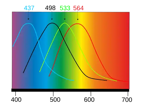 Plus précisément, le pic de sensibilité maximale en vision photopique se situe vers 555 nm (vert-jaune), mais il se déplace vers les courtes longueurs d'onde du spectre à mesure qu'on s'approche de la vision scotopique jusqu'à environ 507 nm (vert-bleu)[2].