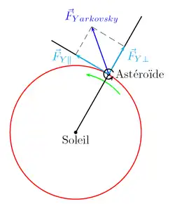 Cette force peut se décomposer, selon l'axe porté par la droite passant par le Soleil et l'astéroïde, et la droite qui lui est perpendiculaire (voir Fig. 1). C'est la composante le long de la trajectoire[2] qui a pour effet une augmentation séculaire du demi-grand axe[3] pour un sens de rotation prograde de l'astéroïde, et une diminution pour un sens rétrograde. Cette force modifie aussi l'excentricité et l'inclinaison de l'orbite, et la vitesse de rotation de l'astéroïde.