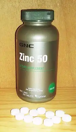 Les suppléments de zinc (souvent des pastilles d'acétate de zinc ou de gluconate de zinc) sont un groupe de compléments alimentaires couramment utilisés pour le traitement du rhume[1]. Il a été démontré que l'utilisation de suppléments de zinc à des doses supérieures à 75 mg/jour dans les 24 heures suivant l'apparition des symptômes réduit la durée des symptômes du rhume d'environ 1 jour chez les adultes[1],[2]. Les effets indésirables des suppléments de zinc par voie orale comprennent le mauvais goût et des nausées[1],[2]. L'utilisation intranasale de vaporisateurs nasaux contenant du zinc a été associée à la perte de l'odorat[1]; par conséquent, en juin 2009, la Food and Drug Administration des États-Unis (USFDA) a averti les consommateurs de cesser d'utiliser le zinc intranasal[1].