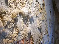 - L'efflorescence secondaire survient quand l'eau imprègne une zone déjà chargée en sel. Des éléments chimiques étrangers interagissent avec les mélanges de maçonnerie, en détériorent les qualités. Les composés dissous résultant de ces réactions chimiques migrent par capillarité vers les surfaces des matériaux et forment des dépôts ou des structures cristallines. L'efflorescence secondaire ne provient donc pas spécialement du ciment Portland, de la chaux ou d'un autre élément minéral du béton[3].