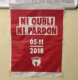 En 2019, le premier anniversaire du drame donne lieu à une série de manifestations à partir du soir du 4 novembre[410],[411], dans un contexte de début de campagne électorale pour les municipales[412]. Une commémoration et huit minutes de silence rue d'Aubagne marque le jour de l'anniversaire[413],[414]; Samia Ghali (PS) est huée pas les manifestants[415] (et ne participera pas à la marche du 9 novembre[323]), pendant qu'à la mairie, Jean-Claude Gaudin (LR) a préféré le huis clos pour remercier les agents municipaux de leur gestion de la crise[413],[416]. La marche de soutien aux victimes et pour un logement digne du samedi 9 novembre[417],[418] rassemble 20 000 personnes selon les organisateurs et 6 700 selon la police[419] derrière une banderole « Ni oublie, ni pardon »[420]. Dix personnes sont arrêtées, un policier blessé et quelques éléments de mobilier urbain dégradés[421]. Une semaine d’hommage aux victimes est organisée par les collectifs d'habitants du quartier. Elle débute avec le baptême de place située à l’intersection des rues d’Aubagne, de l’Arc et Jean-Pierre-Moustier, dite place Homère, qui reçoit le nom de place du 5-novembre[422],[423] officiellement en 2021[424].