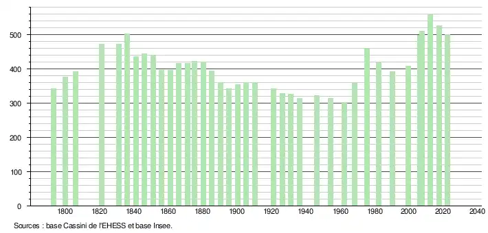 L'évolution du nombre d'habitants est connue à travers les recensements de la population effectués dans la commune depuis 1793. Pour les communes de moins de 10 000 habitants, une enquête de recensement portant sur toute la population est réalisée tous les cinq ans, les populations de référence des années intermédiaires étant quant à elles estimées par interpolation ou extrapolation[23]. Pour la commune, le premier recensement exhaustif entrant dans le cadre du nouveau dispositif a été réalisé en 2007[24].