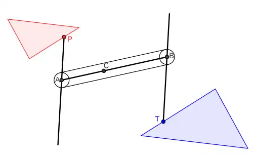 On s'arrange d'autre part pour que CA=AP et CB=BT. Un tel dispositif fait que, si le point C est fixé sur la feuille, le point T est toujours l'image du point P dans l'homothétie de centre C et de rapport - CB/CA.