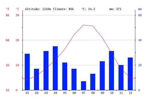 Le climat à El Bayadh, est semi-aride froid. La classification de Köppen est de type BSk. La température moyenne est de 14.2 °C et la moyenne des précipitations annuelles ne dépasse pas 300 mm[6]. Il neige souvent en hiver, à cause de l'altitude[3].