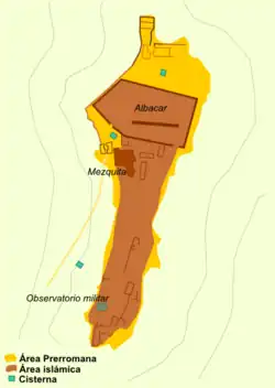 Le plan complet de l'habitation est conservé à la période de l'Al-andalus, qui semble correspondre à un hisn (es) ou place fortifiée d'une certaine hauteur. Le complexe présente l'intérêt d'avoir conservé tout le plan de l'habitation, d'un peu moins d'un hectare, entouré d'un mur qui s'étend sur tout son périmètre, identifiant deux zones à l'intérieur.Le premier est le village lui-même, où l'on trouve la mosquée et d'autres bâtiments attenants, ainsi que des groupes de pièces, articulés par des espaces ouverts ; Dans sa partie la plus haute se trouvent les restes d'une petite tour de guet. La deuxième zone est une zone sans construction reliée aux autres zones par deux entrées et qui est interprétée comme un albacar (enclos). En ce qui concerne les logements, ce sont de grands espaces rectangulaires, pour la plupart sans compartimentage interne, avec des murs de disposition irrégulière, généralement construits sur les restes des précédents, appartenant à la phase ibérique du village. À l'extérieur de ce niveau se trouvaient les défenses préromaines, transformées en un espace de service dans lequel un grand bâtiment a été documenté.