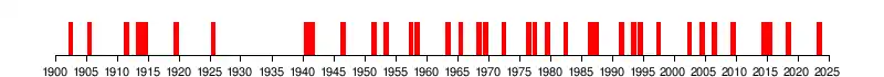 Chronologie (sur une ligne du temps) des épisodes El Niño survenus en plus d’un siècle (à partir de 1900)[16],[17].