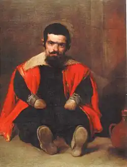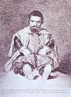 « Assis sur le sol avec une Vareuse tombée, Vêtu de noir avec une Gabardine colorée garnie de passe-main d'or et on n'en voit que les semelles des chaussures Avec une Jarre d'un côté Original de Diego Vélasquez[9],[10] »