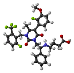 L'elagolix est un médicament utilisé comme inhibiteur de l'hormone de libération des gonadotrophines hypophysaires, donné par voie orale.