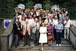 Elaine Morgan est à droite de Machteld (Maggie) Roede, une organisatrice de conférence, sur les premières marches.