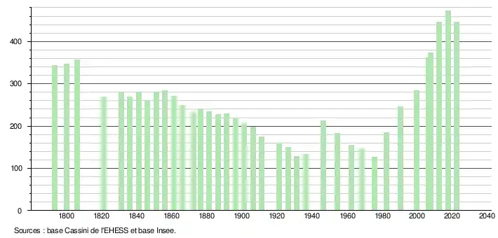 L'évolution du nombre d'habitants est connue à travers les recensements de la population effectués dans la commune depuis 1793. Pour les communes de moins de 10 000 habitants, une enquête de recensement portant sur toute la population est réalisée tous les cinq ans, les populations de référence des années intermédiaires étant quant à elles estimées par interpolation ou extrapolation[25]. Pour la commune, le premier recensement exhaustif entrant dans le cadre du nouveau dispositif a été réalisé en 2007[26].