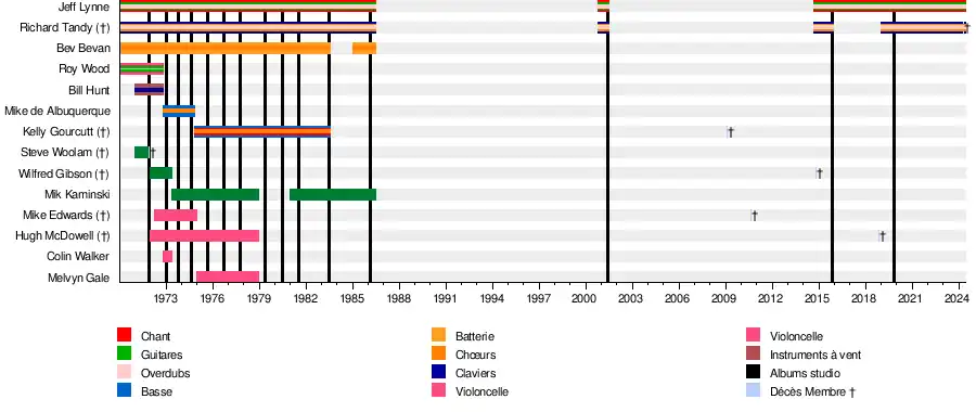 - Jeff Lynne : chant, guitare, basse, claviers, batterie (1970-1986, 2000-2001, depuis 2014)